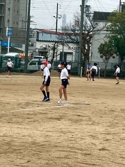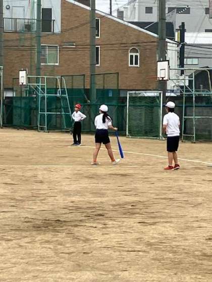 体育で、ベース型ゲームの「ティーボール」をしています。ルールが分からない子たちには、チームで声をかけあって、ゲームを進めています。「いいよ、いいよ。」「ナイス」と、いったよい声かけも多く聞かれ、笑いいっぱいの中、プレイしています。