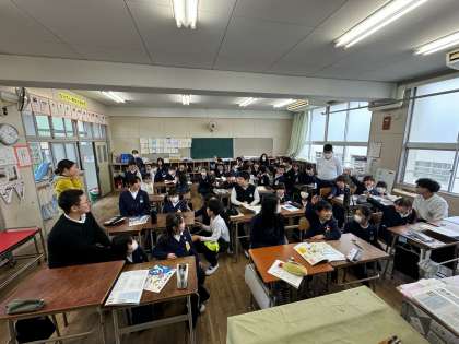 一年生が明日の祝う会に向けて挨拶に来てくれました。今年一年、1.6年生はたくさんの交流をしました?
