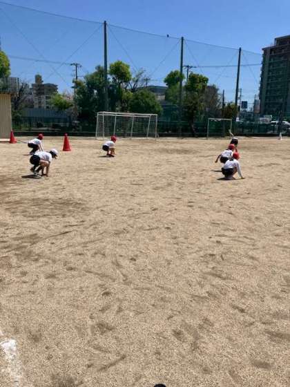 心地よい気候の中の体育。いろいろ走りリレー(カエル走り、後ろ走り、おもしろ走りなど、、、)