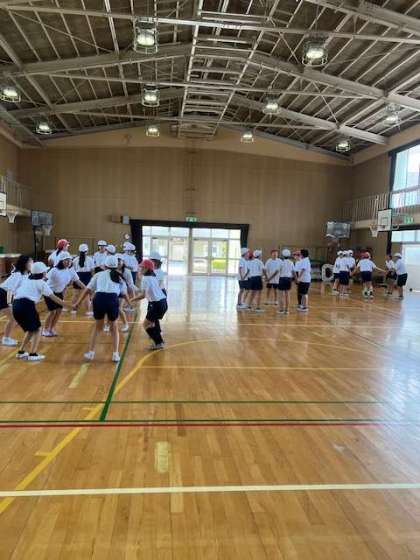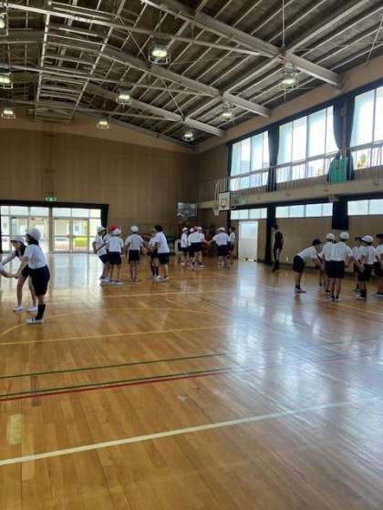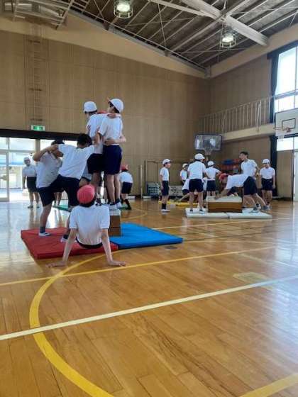 体育でグループに分かれていろいろな運動に挑戦。「大根抜き(写真なし)」「言うこと一緒、やること反対」「岩(とびばこ)のぼり」などをしました。汗だくになりながら、運動を楽しみました。