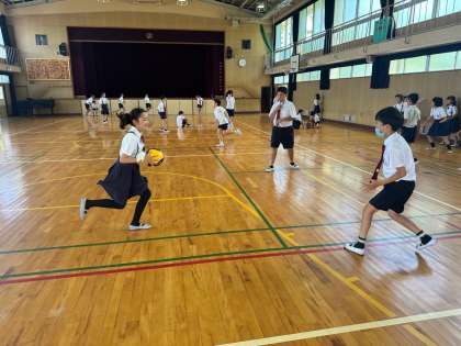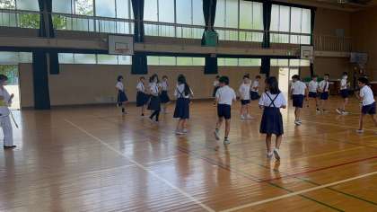 空手係さんが、本格的な空手の型も教えてくれました。みんな、型を覚えようと真剣です。