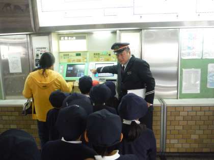 2年生の社会見学です。近鉄矢田駅で駅員さんの話を聞き、自分で切符を買って近鉄針中野駅まで乗りました。