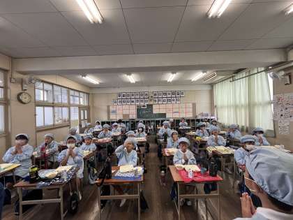 写真は1年生と3年生の「いただきます」です。