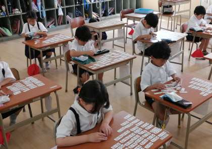 「たしざんかあど」を並べて、たしざんゲームをしました。10が答えのカードはどこかな?と、計算しながらたくさん問題をときました。