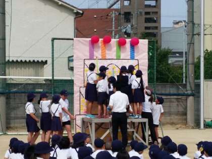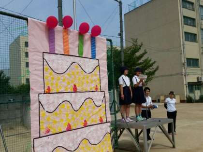 6月11日(土)1時間目は、児童会主催の創立40周年記念おめでとう集会を行いました。大きなバースデーケーキを作り、代表の児童がロウソクの風船を、ハッピバースデーの歌の後に割りました。