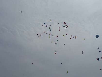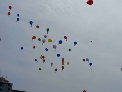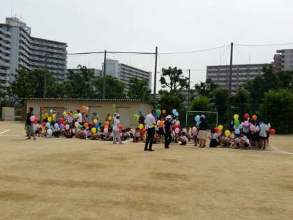 その後、地域の見守り隊の方々と一緒に、熊本地震の復興の祈りを込め、また自分の頑張るめあてを書いた短冊を風船に付けて、青空に飛ばしました。あっという間に小さく見えなくなってしまいました。