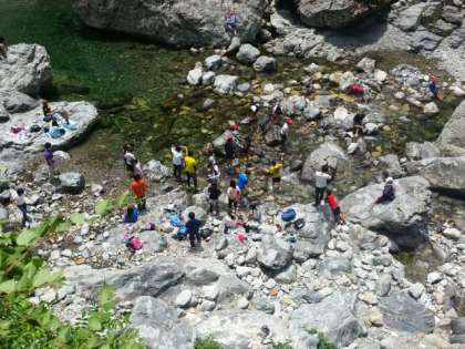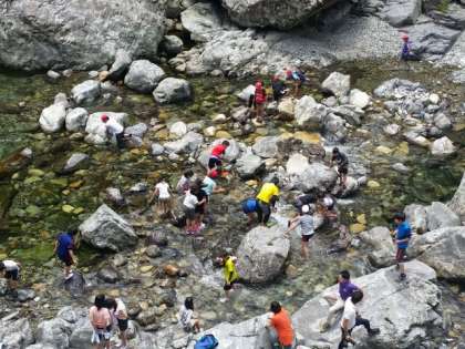ほとんどの児童が川遊びに夢中です。濡れなければよいのですが!