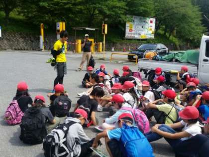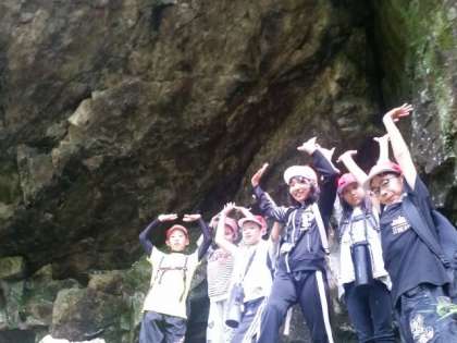 みんなで大きな岩を支えているように見えるかな?最後の休憩場所、洞川駐車場です。ここから10分ぐらいで旅館に着きます。