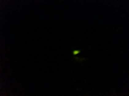 キャンプファイヤ−をしている横の池にホタルがたくさん飛んでいます。緑の光がわかるかな?