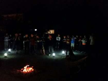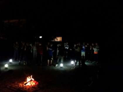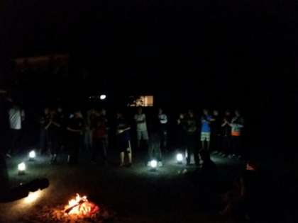 一緒に歌ってくれる人は、前に来てください。の呼び掛けにこたえて、最後はみんなで合唱しました。大盛り上がりのキャンプファイヤ−でした。このあとは、1日の振り返りとハガキ書きです。歯磨きをして、お休みなさいです。しっかり寝てください。