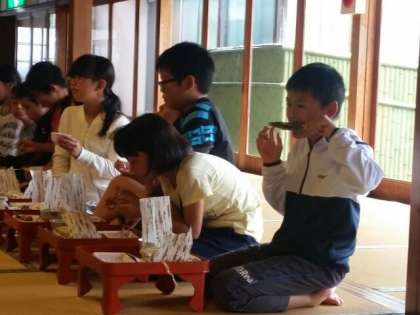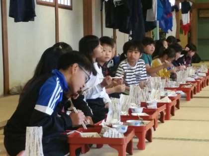 捕まえたアマゴを塩焼きにしていただき、昼食に登場しました。丸かぶりしながら、おいしいおいしいの連発。骨ごとバリバリ食べました。