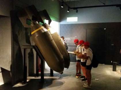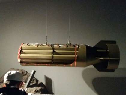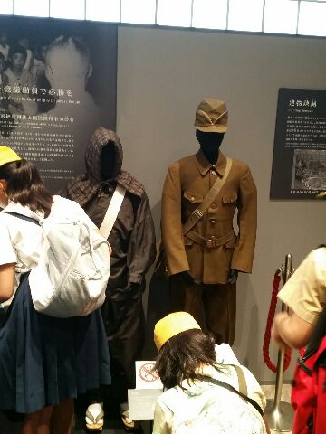 当時の国民の多くが身に付けていた、モンペ、国民服です。しょうい爆弾や1t爆弾の模型が展示されていました。
