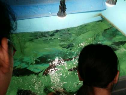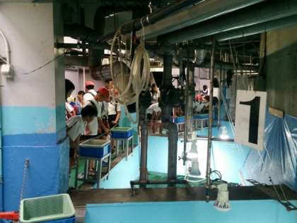 サメや大きなハマチ、タイが、餌を投げ入れると先を争って食べに来ます。あっという間に餌がなくなってしまいました。