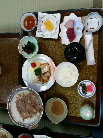 夕食は、一人一人のお膳です。ご飯のおかわりは手を挙げます。お茶は各自です。おかずがたくさんあり、みんなお腹一杯です。