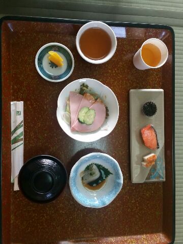 朝食はイカソーメン、鮭の切身とおかずも豊富にあります。美味しいいただきました。