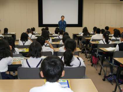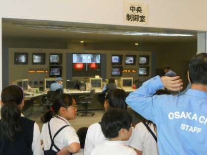 投入ホッパに投入されたごみは、給じん装置で適量ずつ焼却炉内に送られ、燃焼させていきます。ごみピットは、私たちのプールの40倍のかさがあるそうです。燃焼の温度は、900度にもなるそうです。とても清潔感あふれる施設で、中央制御室で監視を続けながら、1年365日24時間ずっとごみを燃やし続けているそうです。ごみの減量化やリサイクル・分別の大切さを改めて感じた見学でした。