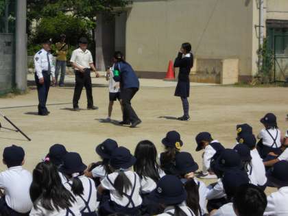 5月17日(土)不審者対応の避難訓練を行いました。学校に侵入した不審者役を警察官の方が演じました。1年生の教室に乱入した不審者を、担任と職員室・保健室・管理作業員の連携のもとで、警察が到着するまでの時間をかせぎ、見事犯人を確保しました。その後、東住吉警察署の方から、路上でおきるかもしれない不審者の誘いから逃げる方法を伝授していただきました。