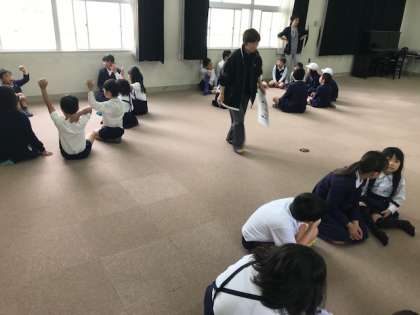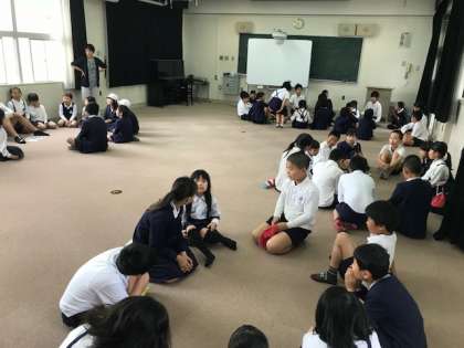 それぞれの班にわかれて決められたゲームをしました。少し難しいゲームもありましたが、高学年のリーダーたちが低学年の子たちに優しく説明して楽しく取り組んでいました。