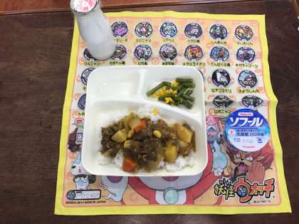 今日のメニューは、ぎゅうにくとだいずのカレーライス、さんどまめとコーンのサラダ、ヨーグルト。