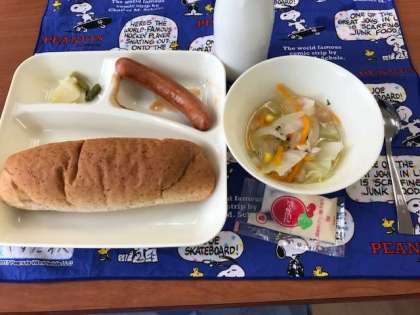 6月8日(金)、今日の給食はライ麦パン、やさいスープ、じゃがいもと三度豆のサラダ、ウィンナーのケチャップソースでした。
