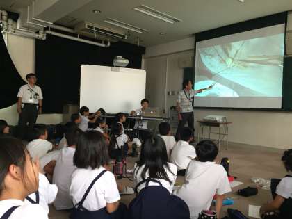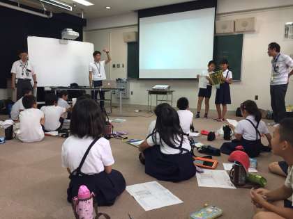 7月3日(火)の3・4限目に「いきものさがし」の体験学習がありました。運動場で、アオスジアゲハやテントウムシのさなぎ、カマキリの卵など、たくさんのいきものを見つけました。また、ホコリタケというきのこも見つけました。その後、多目的室で見つけたいきものを発表しあいました。