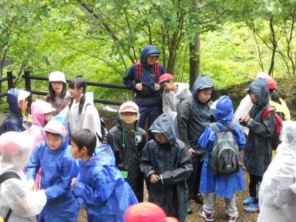 みたらい渓谷へ向けてハイキング出発。カッパを着ての道中となりましたが、みな足取りも軽く元気いっぱいです。みたらいの滝に到着し、休憩所の小屋をお借りしてお弁当をたべました。