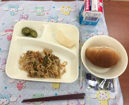 9月7日(金)、今日の給食はやきそば、きゅうりの甘酢漬け、二十世紀なし、こくとうパン、牛乳でした。