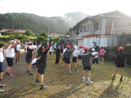 3日目の朝です。快晴。イワツバメの巣が宿舎の屋根の裏にありました。子どもたちは、朝会でしっかり体操し、元気いっぱいです。