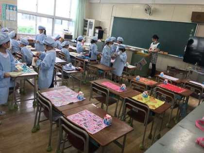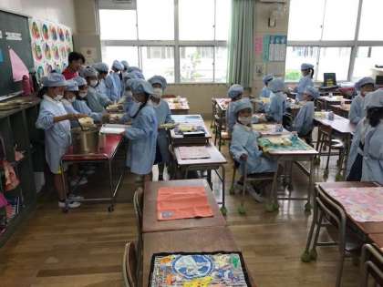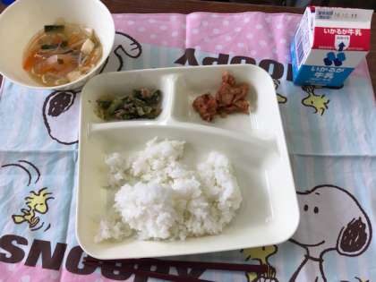 10月5日(金)、今日の給食はごはん、けいにくのチリソースやき、とうふとワンタンのかわのスープ、ちゅうかいため、牛乳です。