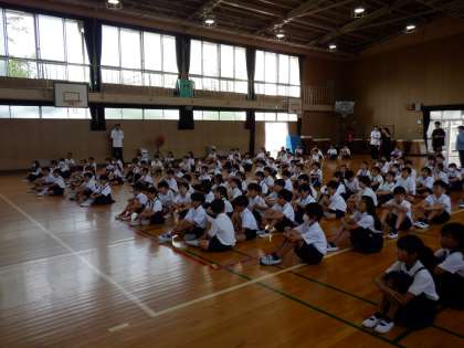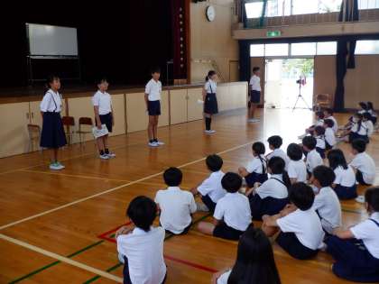 今日に児童朝会では、新しく学校に編入してきたお友達を紹介しました。