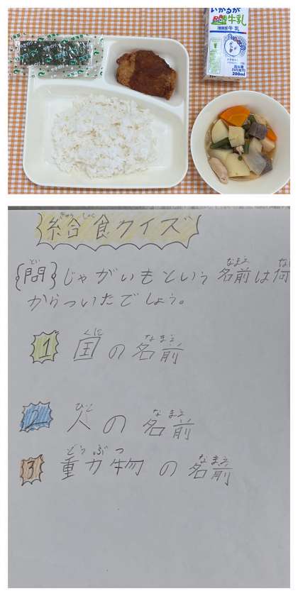 愛知県を中心とした地方の料理です。一口トンカツに八丁みそ、赤みそなどで作ったタレをかけています。じゃがいもと野菜の煮ものは、鶏肉、じゃがいも、にんじんなどの野菜をけずりぶしで取った出汁で煮ています。