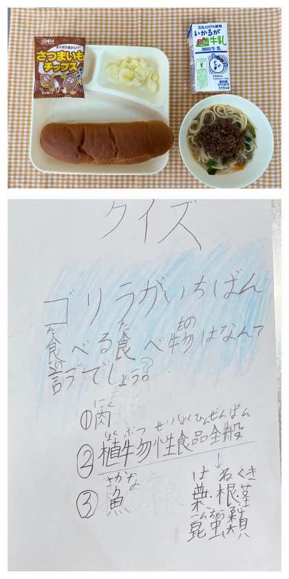 チンゲンサイ、もやし、にんじんの入った汁めんに、テンメンジャンで味付けした肉みそを乗せて食べます。子どもたちに人気のある麺の献立でした。