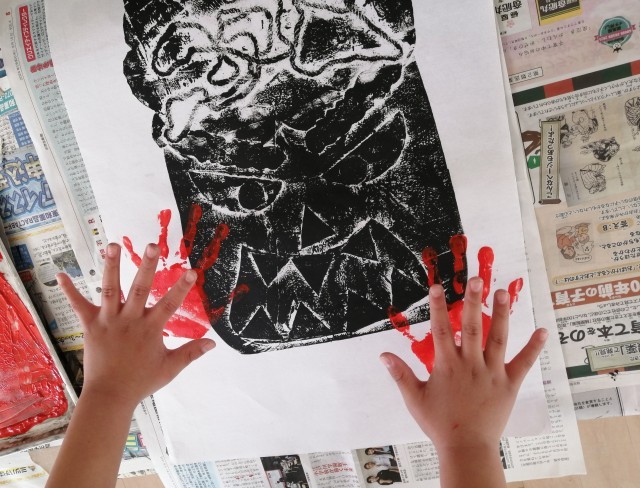 目や口などの表情を工夫しながら、画用紙でおにの版を作り、版画をしました。