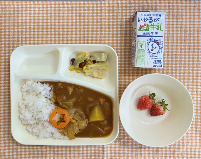 子どもたちに人気のカレーライスといちごを組み合わせた献立で、残食はありませんでした。