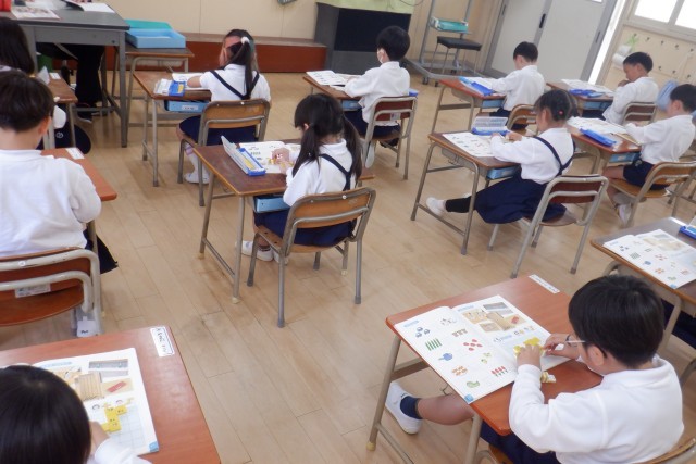算数の「いくつといくつ」の学習では、「5はいくつといくつ」「6はいくつといくつ」とブロックを使って学んでいます。