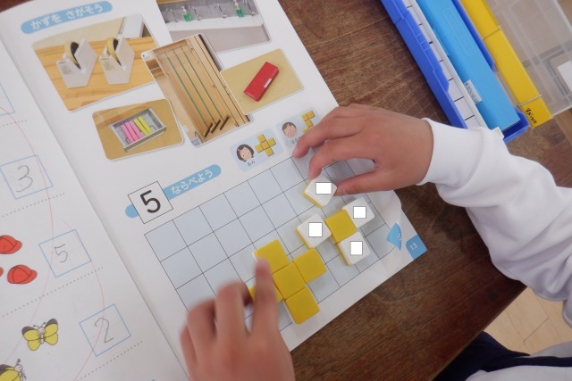 ブロックを動かしたり手で隠したりしながら、数の勉強をがんばっています!