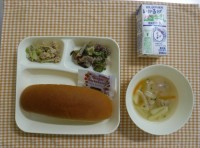 今日の献立☆コッペパン・いちごジャム☆豚肉のガーリック焼き☆スープ☆ツナとキャベ...