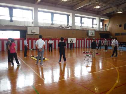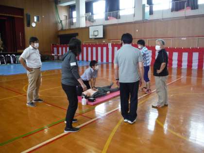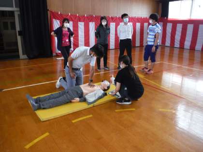 今回、心臓マッサージの連携を主に、救急車到着までの8分間を実践してもらいました。