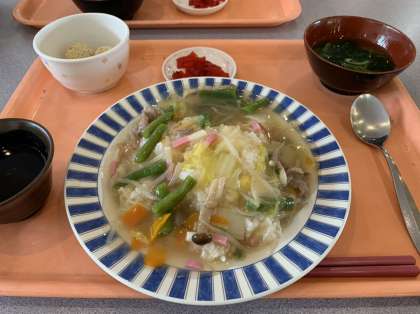 メニューは、中華丼とお吸い物、そしてゴマ団子です。