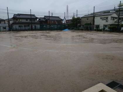 朝からずっと雨が降り続き、運動場が池のようになってしまっています。