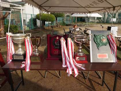 写真が優勝杯・準優勝盾です。左から長谷川杯、中学校優勝杯、中学校準優勝盾、小学校優勝杯、小学校準優勝盾です。