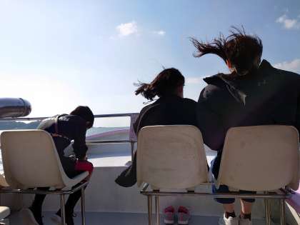 強い海風が吹いていますが、船室上のデッキに出て、クルージングと風景の移り変わりを楽しんでいます。