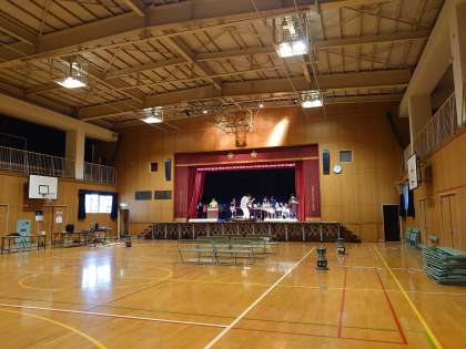 5時間目、講堂に小学生全員が集まり、スクールフェスティバルに向けた合奏の練習を行いました。
