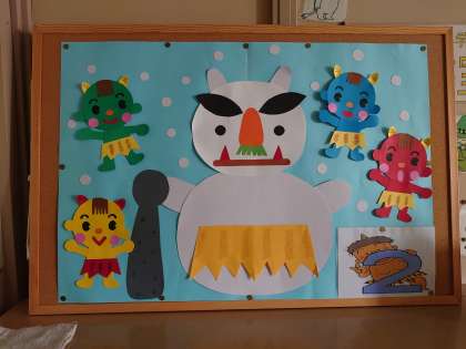 2月は何といっても「節分」ですので、小学校・中学校の図書室前には、いずれも「鬼」をイメージした掲示板が飾られています。