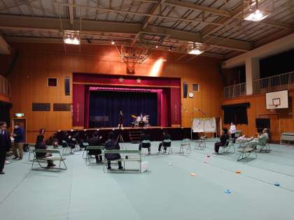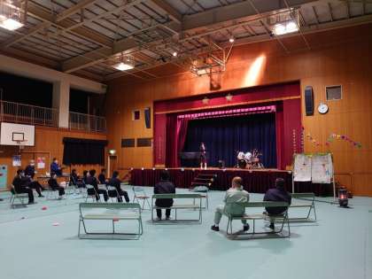 2年生は3年生のために歌を披露しました。短い練習時間の中で歌を覚え、ドラムの練習も行ってきました。