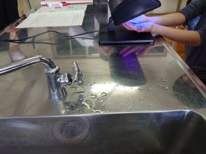 右の画像ですが、蛍光剤入りのローションをつけたあとで手洗いし、洗い残しがないかブラックライトで確認している様子です。蛍光剤が残っているところ、つまり洗い残しがあるところが目立つ子どもたちも多く、子どもたちも少しショックを受けていました。