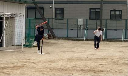 体育の先生とソフトボールで守備練習です。先生にノックしてもらい、ソフトボールの癖のある動きに取りづらそうになっていることもありましたが、しっかり追いつき返球していました。