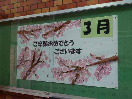 毎月、季節に応じた作品を掲示していますが、3月は先生方が協力して作成した作品が掲示されています。