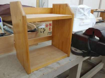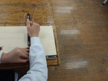 【中学・写真左と中】 1年生技術科の授業で、木工作業がはじまりました。最初は木材を切るために正確に印をつけていきます。がんばって写真にある棚の完成を目指します。