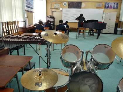 【中学・写真左】中学2年生の音楽授業です。今日は歌の練習から音符や記号の確認をしていました。長谷川小・中学校の音楽室にはギターやドラムがあります。気軽にドラムに親しめることから、普段からリズム感を養える恵まれた環境にあります。